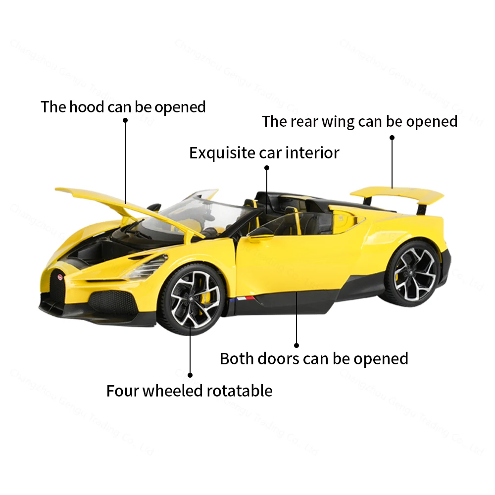 Cette reproduction fidèle met en valeur les lignes spectaculaires et le design exclusif de la Bugatti Mistral. Conçue avec une carrosserie en métal moulé sous pression (die-cast), complétée par des pièces en plastique de qualité, elle offre un rendu réaliste et robuste, idéal pour les collectionneurs exigeants.